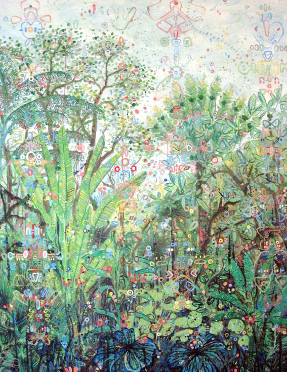Hand-brushed acrylics on canvas form the basis of my work, created without stencils or digital tools. Several pieces feature glossy elements, adding to the colors and texture.